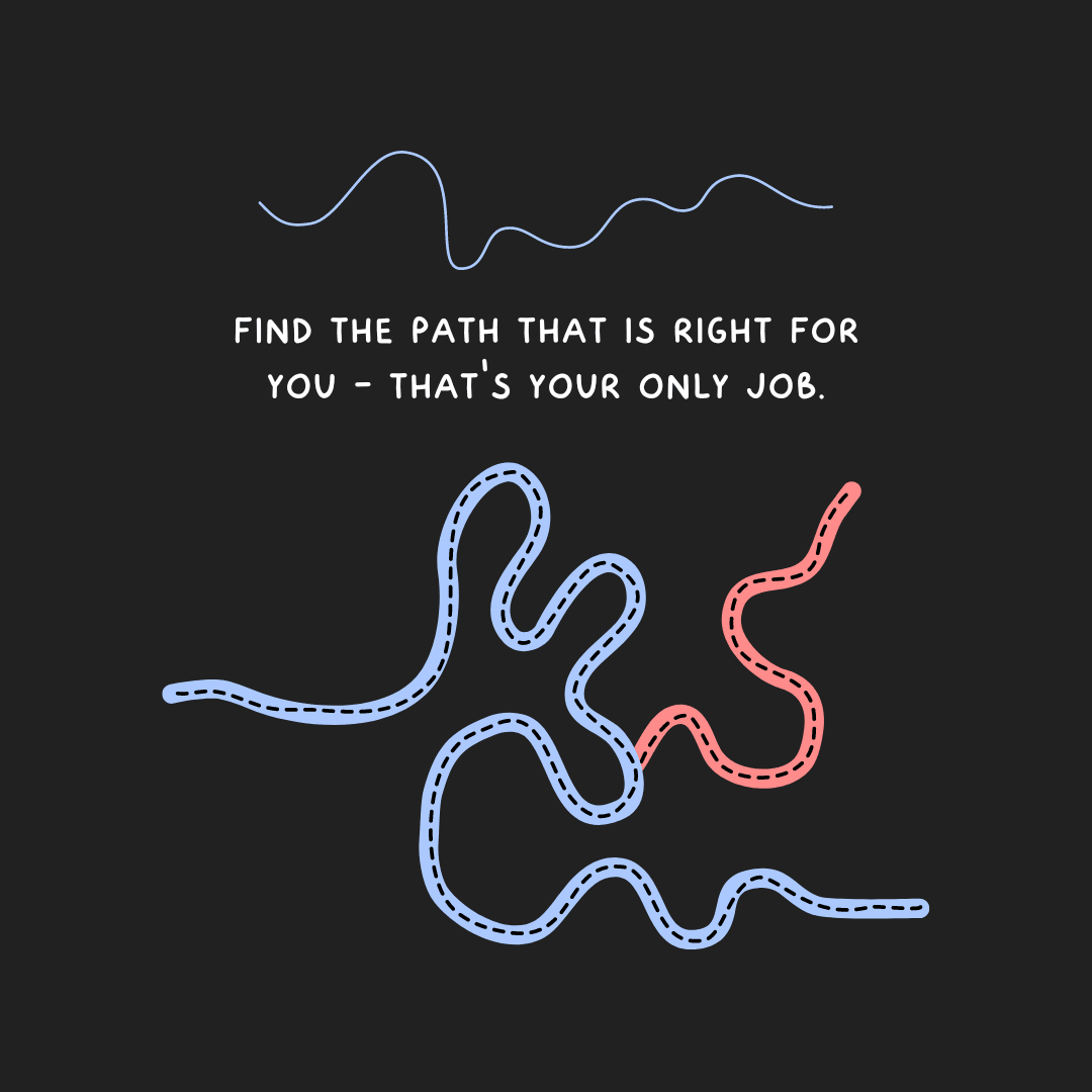 Your only job is to discover what works for you. This is your life. The expectations of others can shrink our story and sap our spirit. Allow yourself to take wrong turns and bump into corners and curbs as you discover the story that is truly yours to live. The maze is the mystery. Explore and find your way.