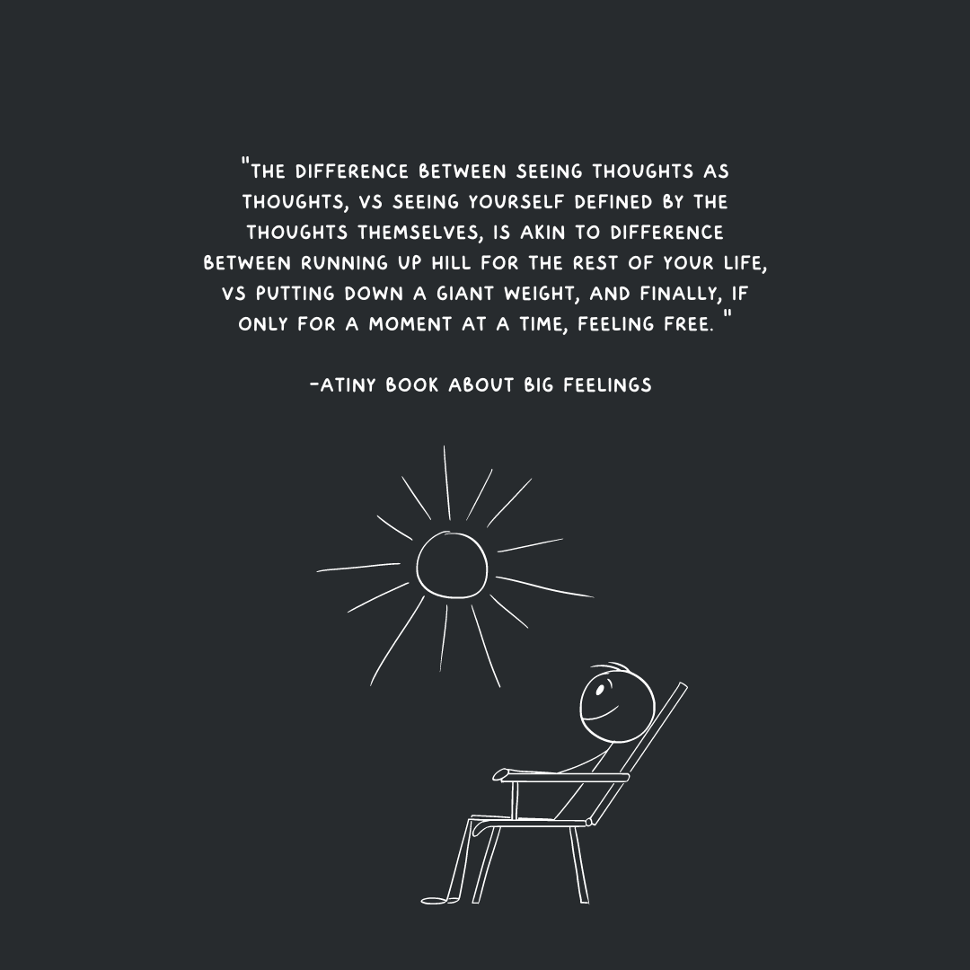 "THE DIFFERENCE BETWEEN SEEING THOUGHTS AS THOUGHTS, VS SEEING YOURSELF defined by the THOUGHTS THEMSELVES, IS akin to DIFFERENCE BETWEEN RUNNING UP HILL for the rest of your life, vs putting down a giant weight, and finally, if only for a moment at a time, feeling free. " -atiny book about big feelings