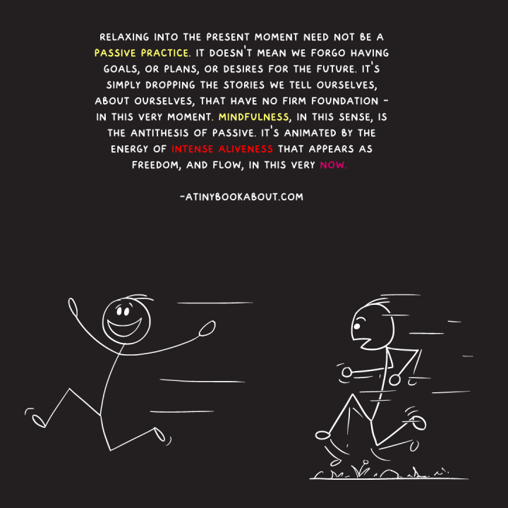 Relaxing into the present moment need not be a passive practice. It doesn’t mean we forgo having goals, or plans, or desires for the future. It’s simply dropping the stories we tell ourselves, about ourselves, that have no firm foundation – in this very moment. Mindfulness, in this sense, is the antithesis of passive. It’s animated by the energy of intense aliveness that appears as freedom, and flow, in this very now.